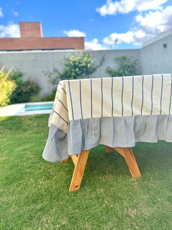 Mantel de tusor color crudo con rayas y volados color azul denim
